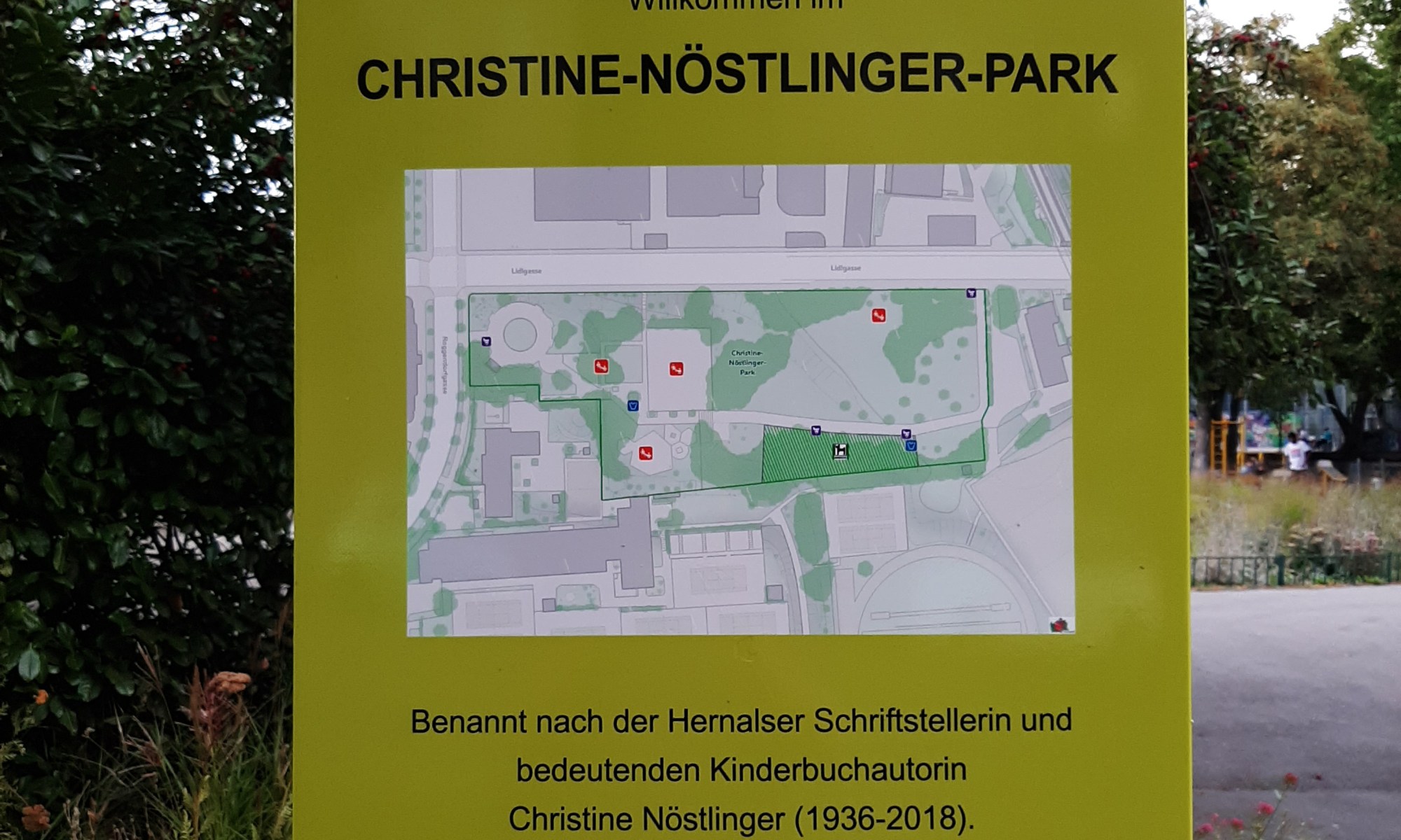 Benannt wurde der Park nach der größten österreichischen Kinderbuchautorin Christine Nöstlinger. In unmittelbarer Nähe gibt es seit 2020 auch den Christine Nöstlinger-Hof, einem Gemeindebau in der Hernalser Hauptstraße 98. Die Autorin ist in Hernals aufgewachsen und hat vor allen ihre Kindheit im zerstörten Nachkriegs-Wien in ihrem wohl wichtigsten und verfilmten Werk, „Flieg, Maikäfer, flieg“ verarbeitet.