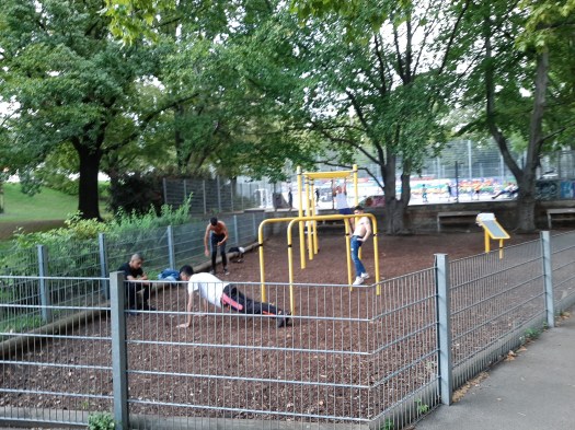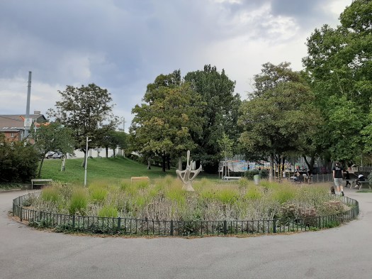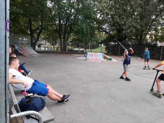 Gestaltet ist er hervorragend und bietet so viel. Neben der neuen Toiletteanlage und dem Kunstobjekt im unteren Bereich vor allem der Kinderspielplatz, die Hundezone und die vielfältigen Sportmöglichkeiten. Da gibt es Cross-Fit-Geräte, Tischtennistische, einen Fußballkäfig und Skaterpark sowie seit kurzem auch eine Slackline-Möglichkeit.