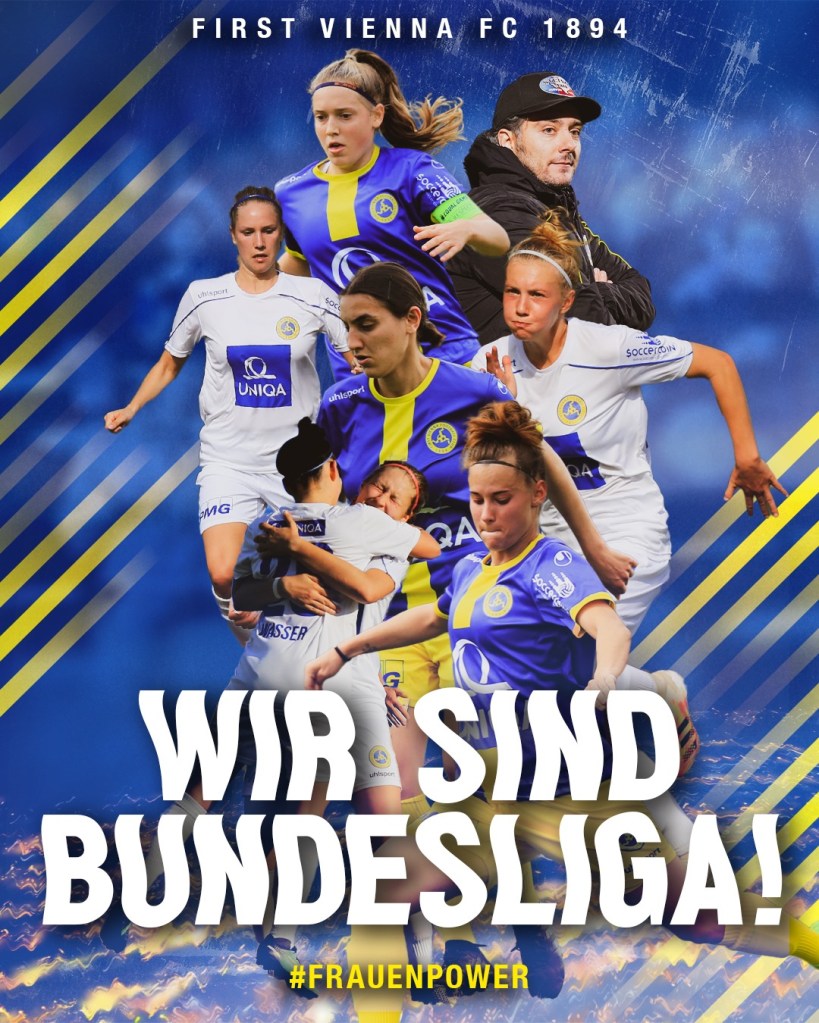 Ein weiterer Sieg hat sich für, die sich mit uns den Platz teilenden, Fußball-Frauen-Team des First Vienna FC 1894 ergeben womit ein klarer Aufstieg in die österreichische Frauen-Bundesliga geschafft wurde. Die Vienna, als Verein der sowohl im Männer- und Frauen-Sport aktiv ist, stellt somit das erste Wiener Frauenteam in der höchsten Klasse, welches nicht durch Kooperation den Platz eingenommen hat. Auch dazu herzliche Glückwünsche, verbinden mich ja einige leistungsrelevante Ereignisse damit… Liebe Christa Hainzl: Toll gemacht! Aschot Movsesian und Julian Puig: absolut verdient!!!